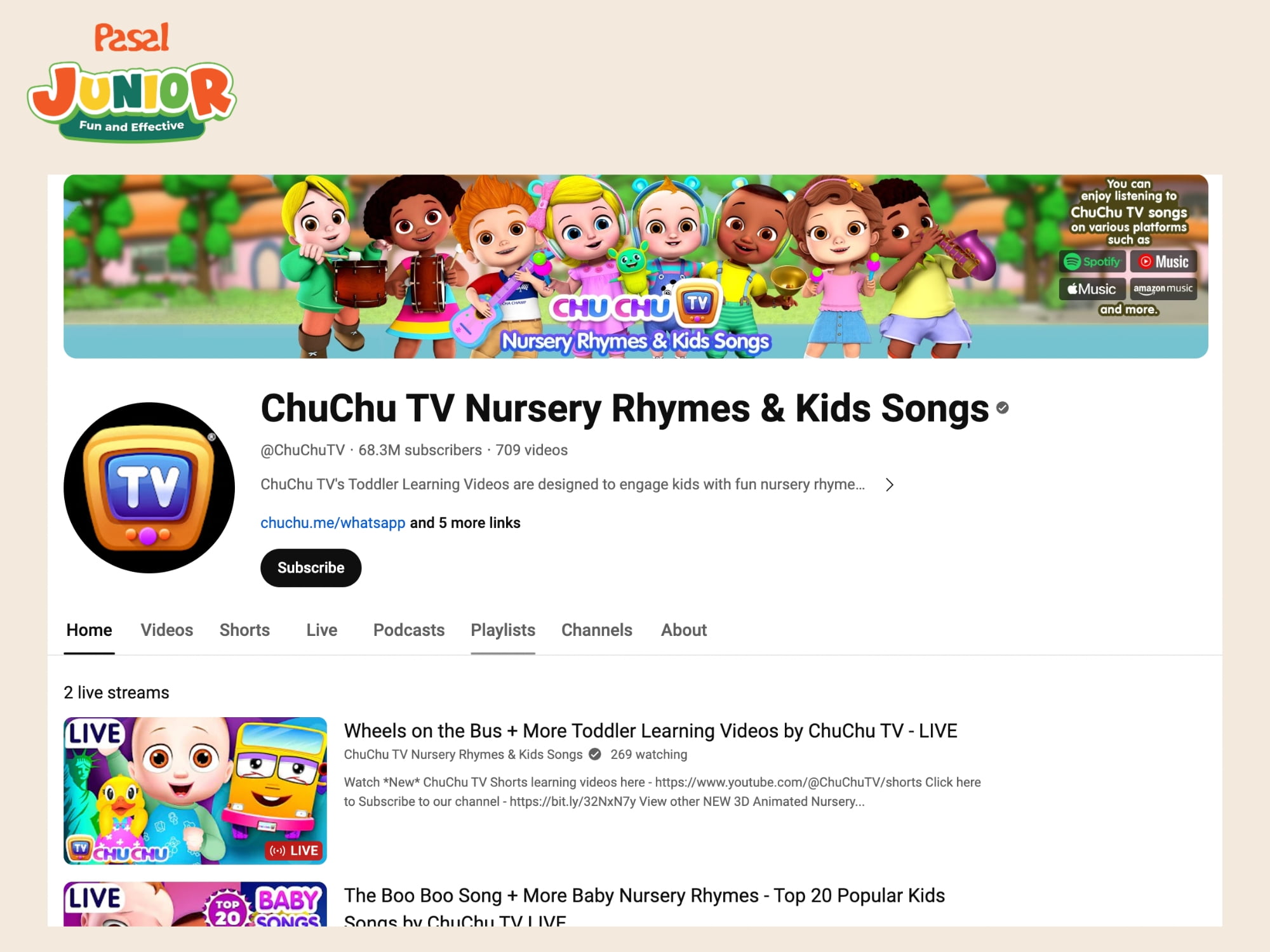Kênh YouTube ChuChu TV Nursery Rhymes & Kids Songs có hơn 50 triệu lượt theo dõi và là một nguồn học tập và giải trí phổ biến cho trẻ em trên toàn thế giới. Nội dung đa dạng, tập trung vào các bài hát vui nhộn và câu chuyện đồng giáo.