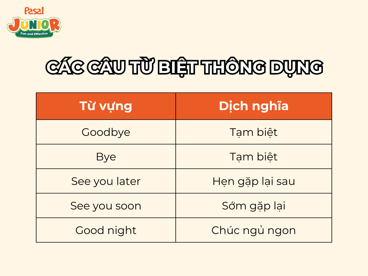 Cũng như các câu chào hỏi, cách nói từ biệt lịch sự cũng là một kỹ năng quan trọng mà trẻ cần được học. Các câu từ biệt thường dùng để kết thúc một cuộc trò chuyện hoặc chia tay trong những tình huống khác nhau.