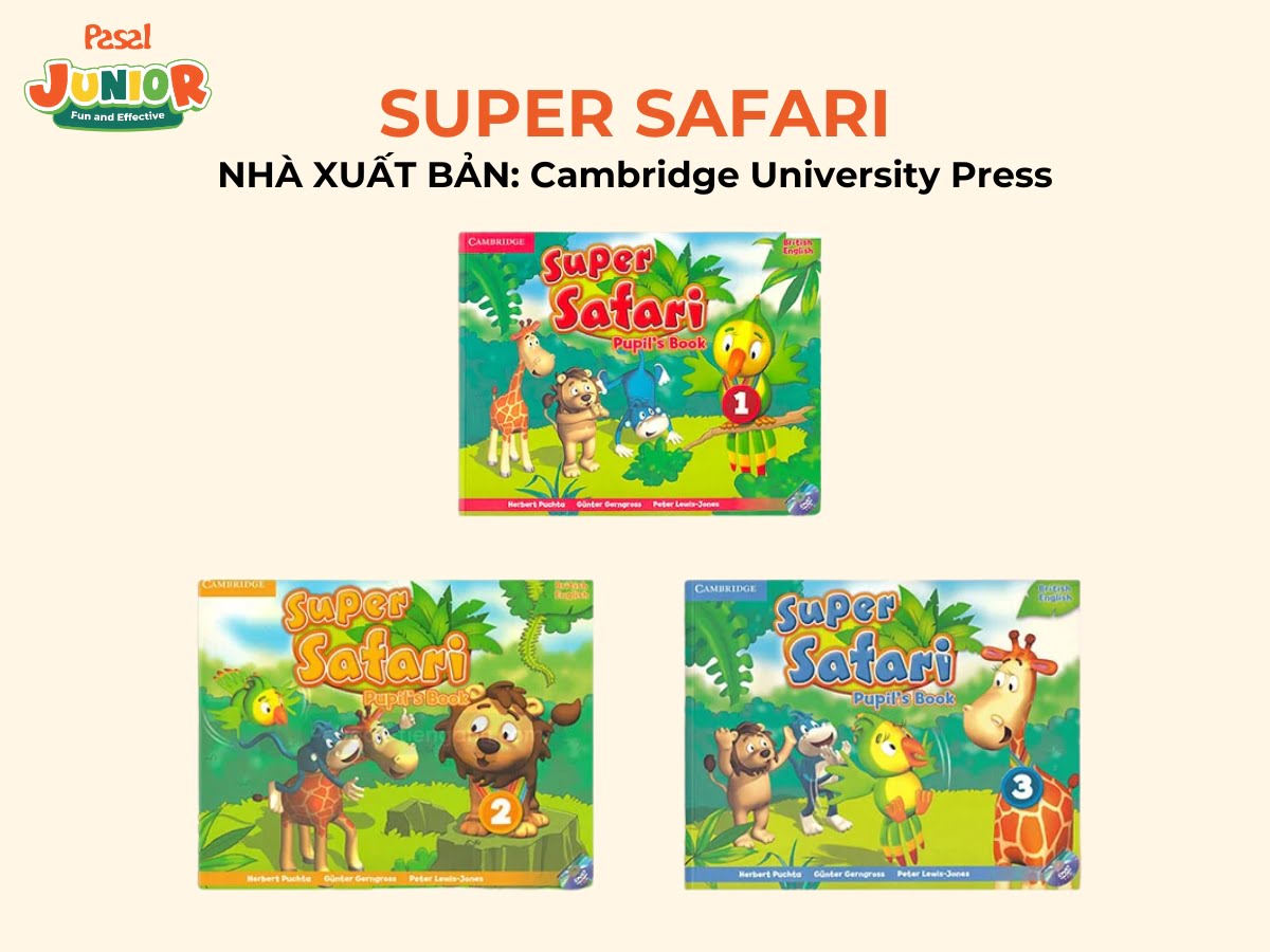 Giới thiệu: “Super Safari” là bộ sách tiếng Anh dành cho trẻ em từ nhà xuất bản Cambridge University Press. Bộ sách giúp trẻ học tiếng Anh qua các câu chuyện phiêu lưu của các nhân vật động vật dễ thương.