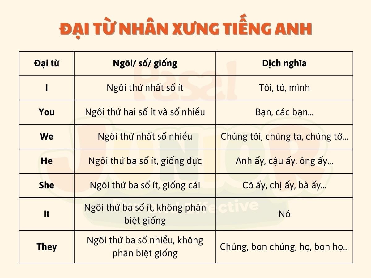 Dưới đây là bảng tổng hợp chi tiết về đại từ nhân xưng: