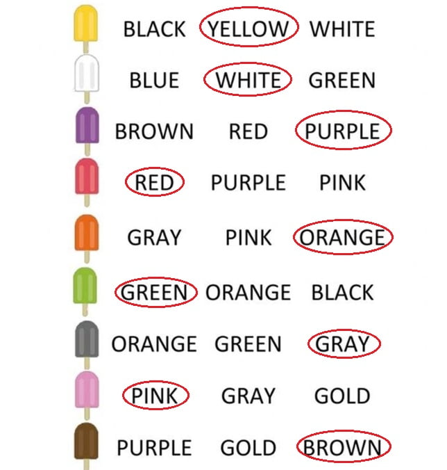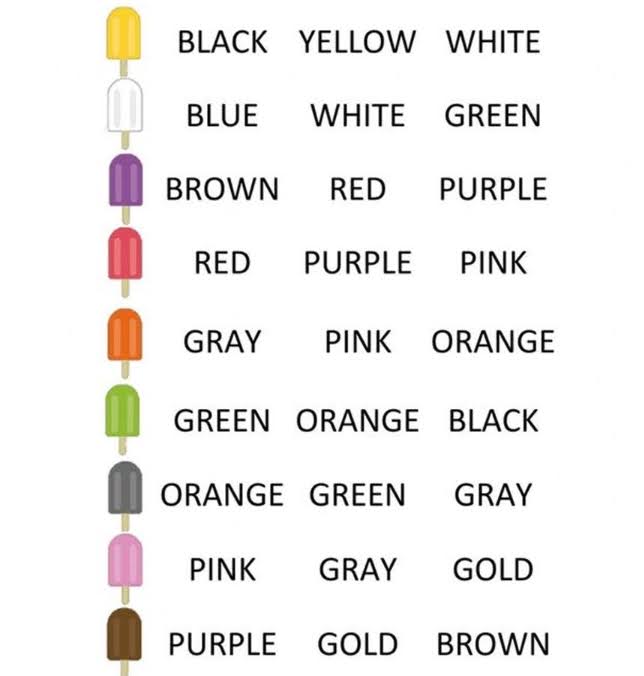 Các bé hãy nhìn vào bức tranh và khoanh tròn vào từ vựng mô tả đúng màu sắc của que kem: