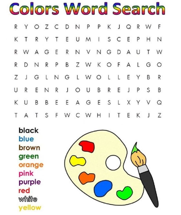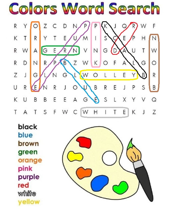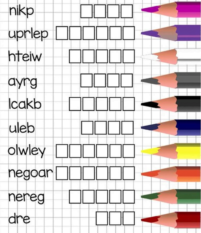 Các con hãy nhìn vào bảng chữ cái và tìm các từ chỉ màu sắc và khoanh tròn lại đáp án: