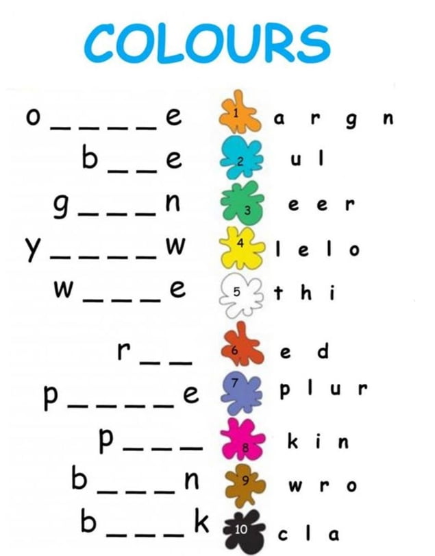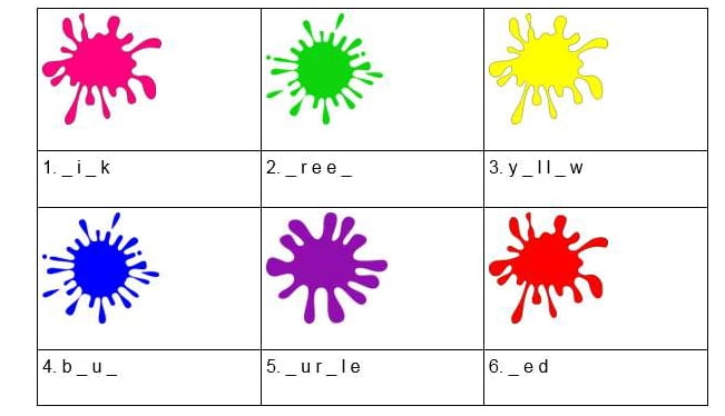 Các bé hãy nhìn và điền chữ cái gợi ý vào ô trống để tạo thành từ chỉ màu sắc chính xác: