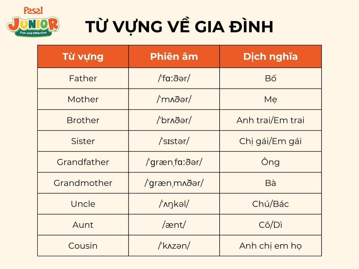 Gia đình là một trong những chủ đề quen thuộc nhất đối với trẻ em. Việc học các từ vựng liên quan đến các thành viên trong gia đình sẽ giúp trẻ dễ dàng hơn trong việc diễn đạt và giao tiếp.