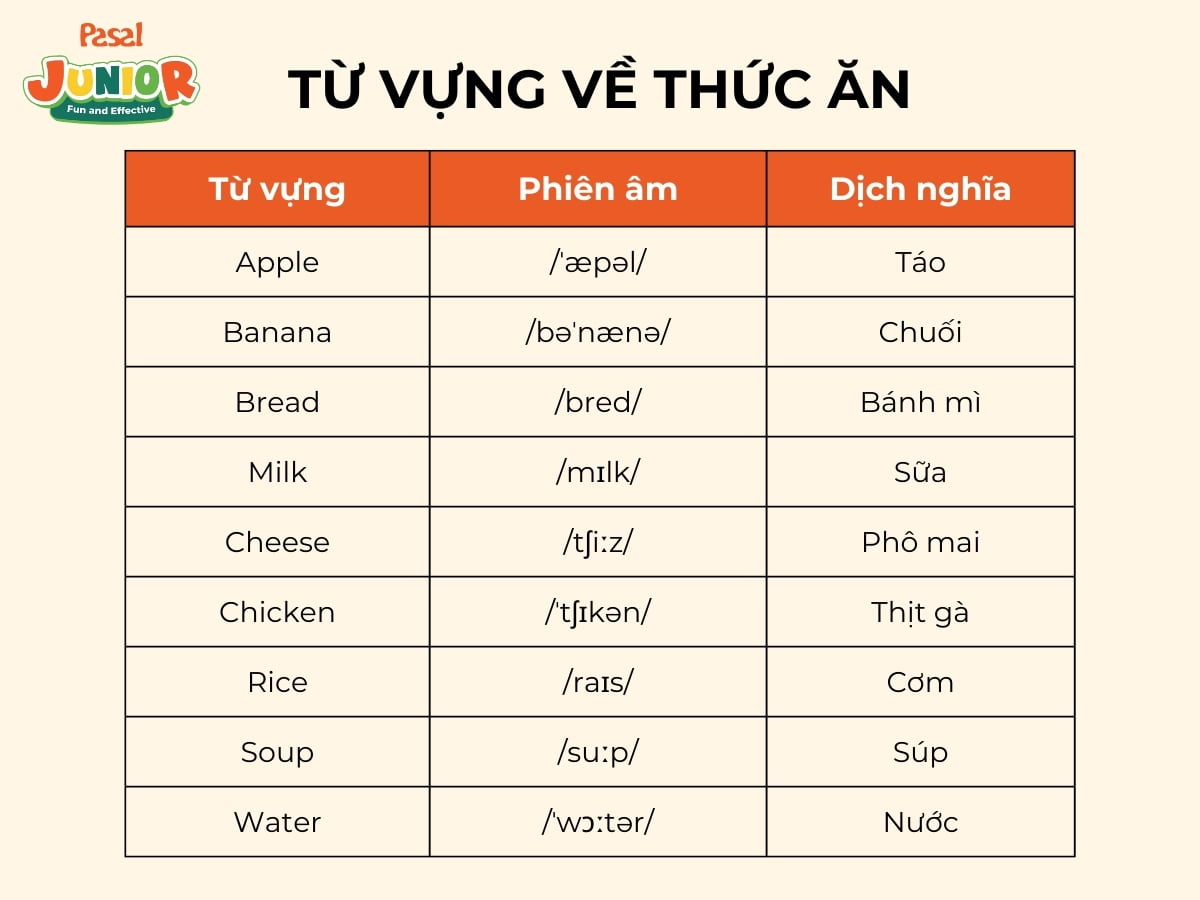 Thức ăn là một chủ đề gần gũi và thú vị với trẻ em. Việc học từ vựng về các loại thức ăn không chỉ giúp trẻ biết thêm về các món ăn mà còn có thể áp dụng trong cuộc sống hàng ngày.