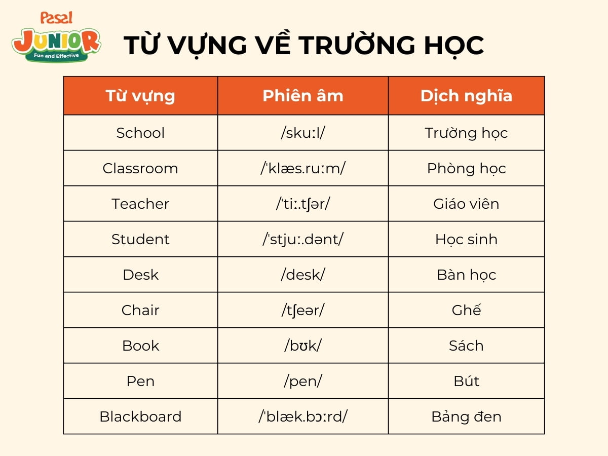 Trường học là nơi mà trẻ em dành phần lớn thời gian trong ngày. Việc biết các từ vựng liên quan đến trường học sẽ giúp trẻ dễ dàng hơn trong việc học tập và giao tiếp với bạn bè và thầy cô.